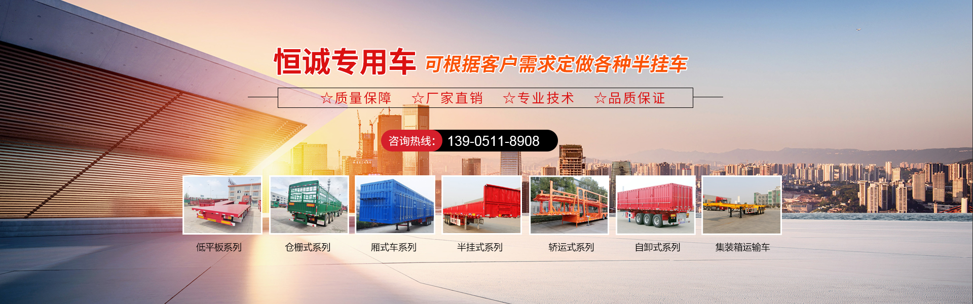 現(xiàn)有半掛車生產(chǎn)線,自卸車生產(chǎn)線,低平板生產(chǎn)線,轎運(yùn)車生產(chǎn)線,垃圾車,洗掃車,清洗車,超大件運(yùn)輸及特種車輛等100多種產(chǎn)品,可按需定制化生產(chǎn),滿足個(gè)性化需求。全方位服務(wù)以及售后優(yōu)勢(shì)